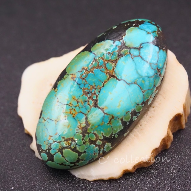 ハイグレード チャイニーズ クラウドマウンテン ターコイズ ルース CM-01 またはフーベイターコイズとも呼ばれます。 スタビライズド ブラックスパイダーウェブにくっきりと濃いブルーが浮かびます。サイドに丸みを持たせた厚みも十分にある大粒のルースです。この大きさのものは手に入りにくく、価格も高騰しています。光の反射でわかりにくいですが、サイドに近い数カ所に薄いブルーの部分があります。画像3の右手前等。 大粒 46,9ct 28,1 x 25,7 x 7,2 mm(バッキング含) ルースケースに入れてお届けします。 画像6はiphoneで 曇天、窓際で撮影。 *今回初めて直接中国より取り寄せました。まだまだ少量ですが、良質のものです。ぜひ他もご覧ください。 *画像は実物に近く写るよう努力していますが、光の具合や背景、お手持ちのパソコン、携帯の画面等により少々違って見える事があります。