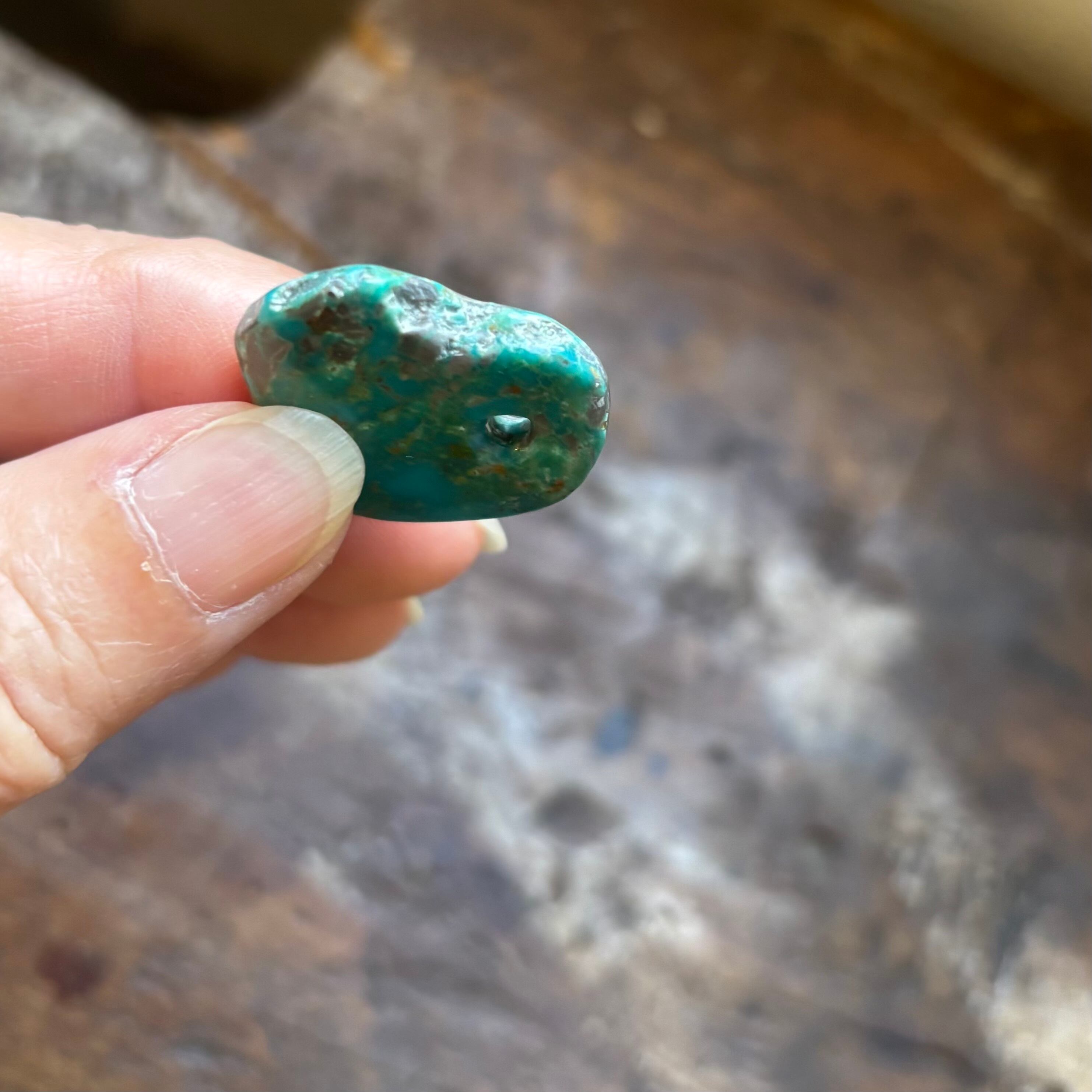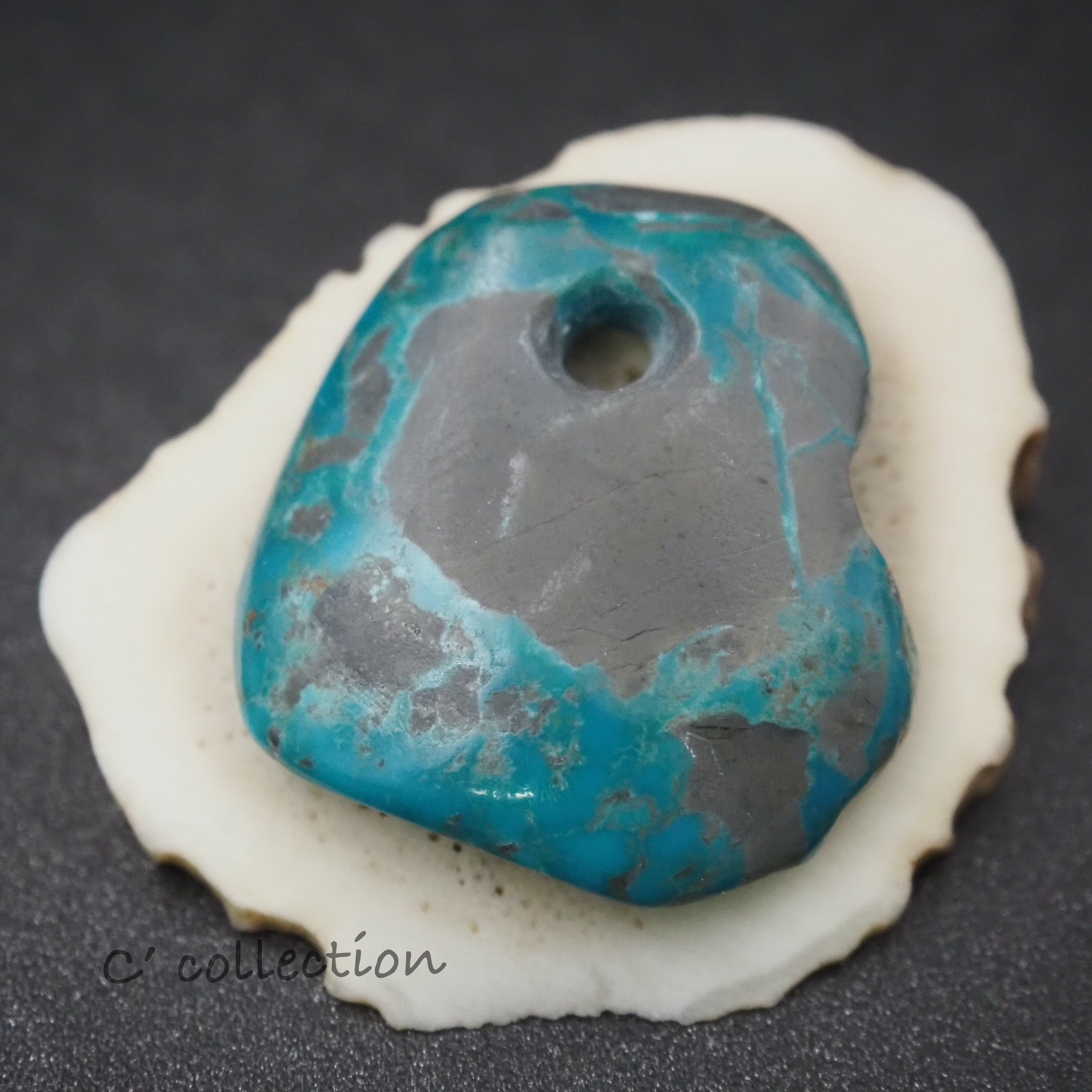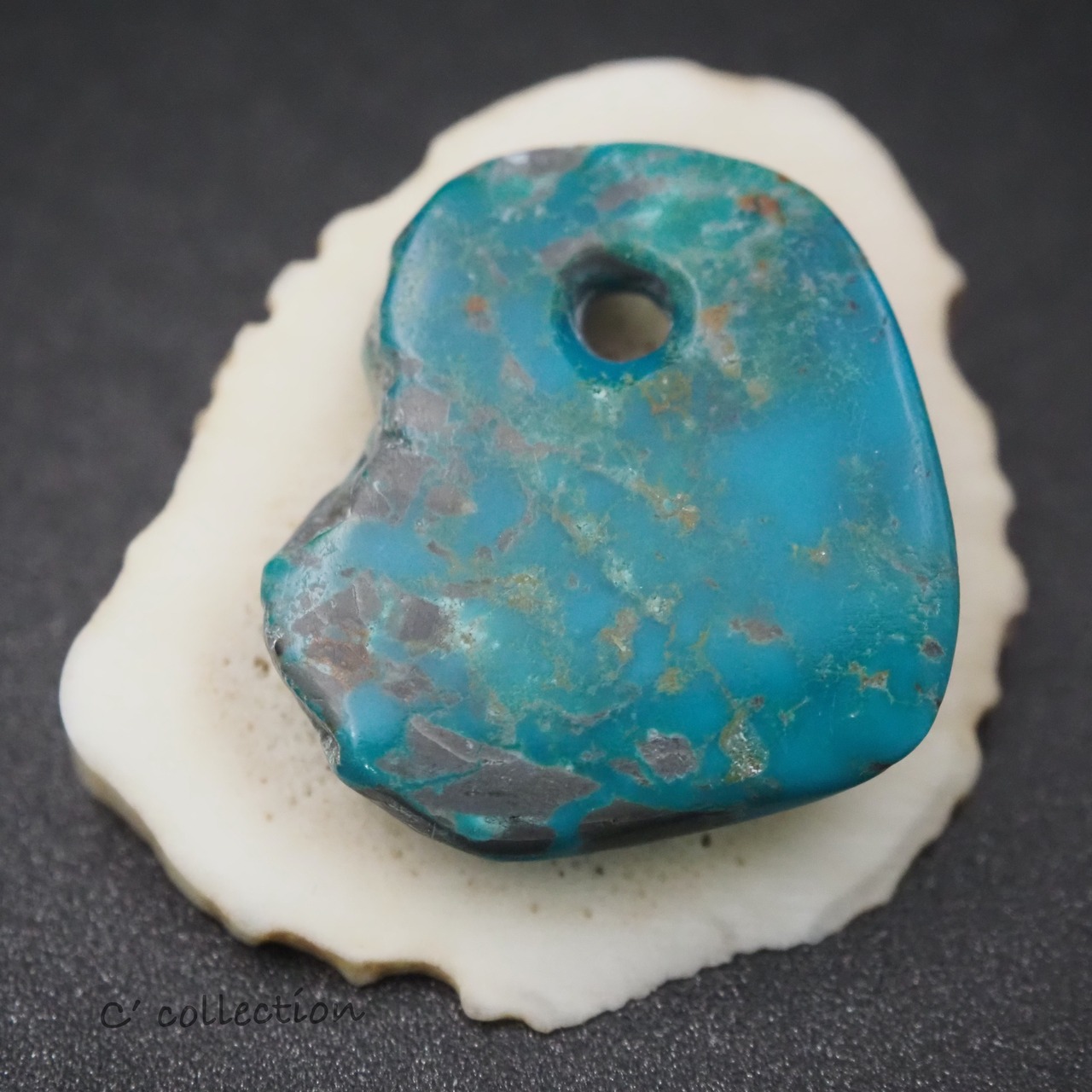 濃いブルーグリーンカラーのフリーフォーム ビーズです。トップにも十分な大きさあり。リバーシブルですが、片面には大き目の母岩が居座っています。母岩側がややぷっくりとラウンドし、もう片面は比較的水平です。母岩(ダークブラウン)はやや柔らかめ。整え切らないラフシェイプです。