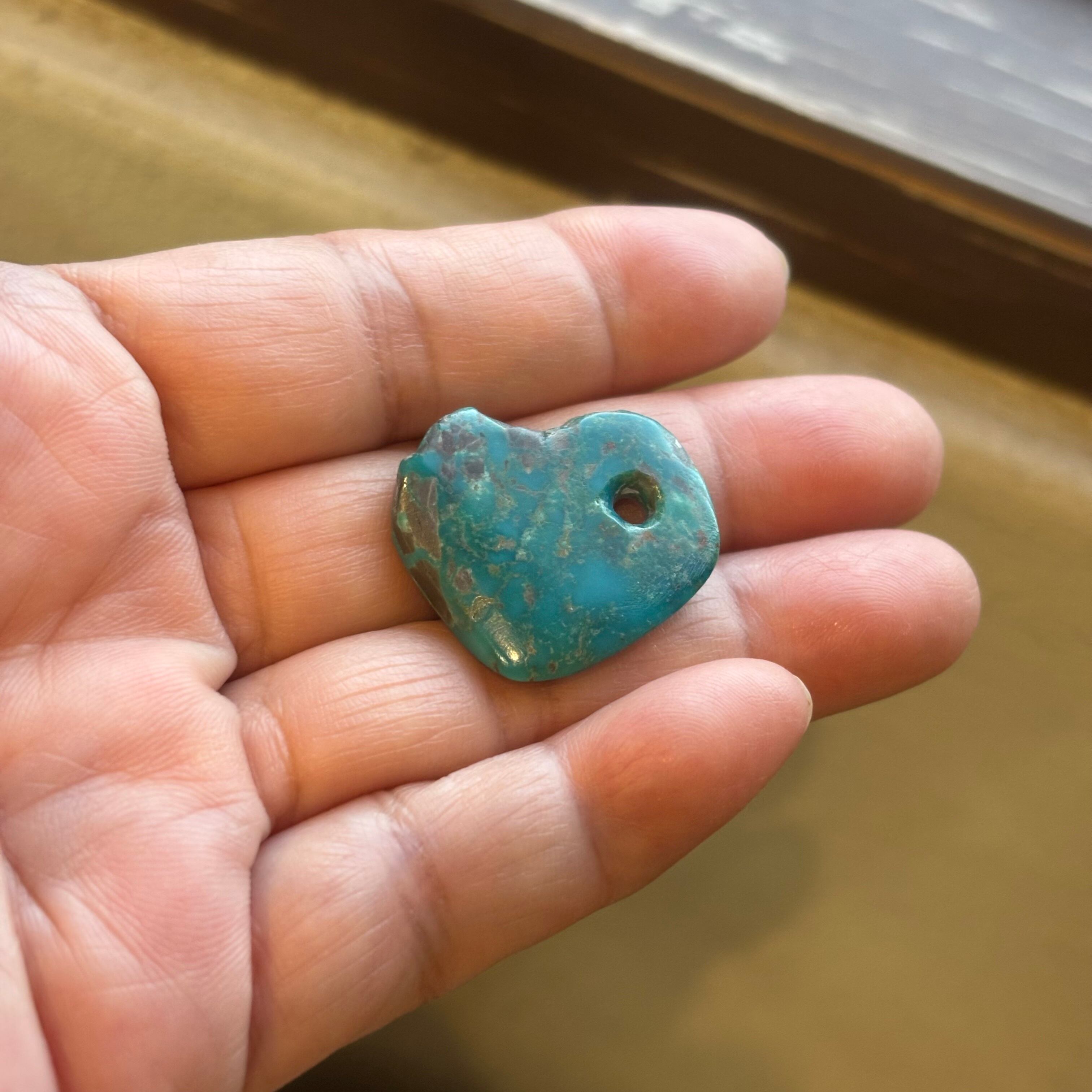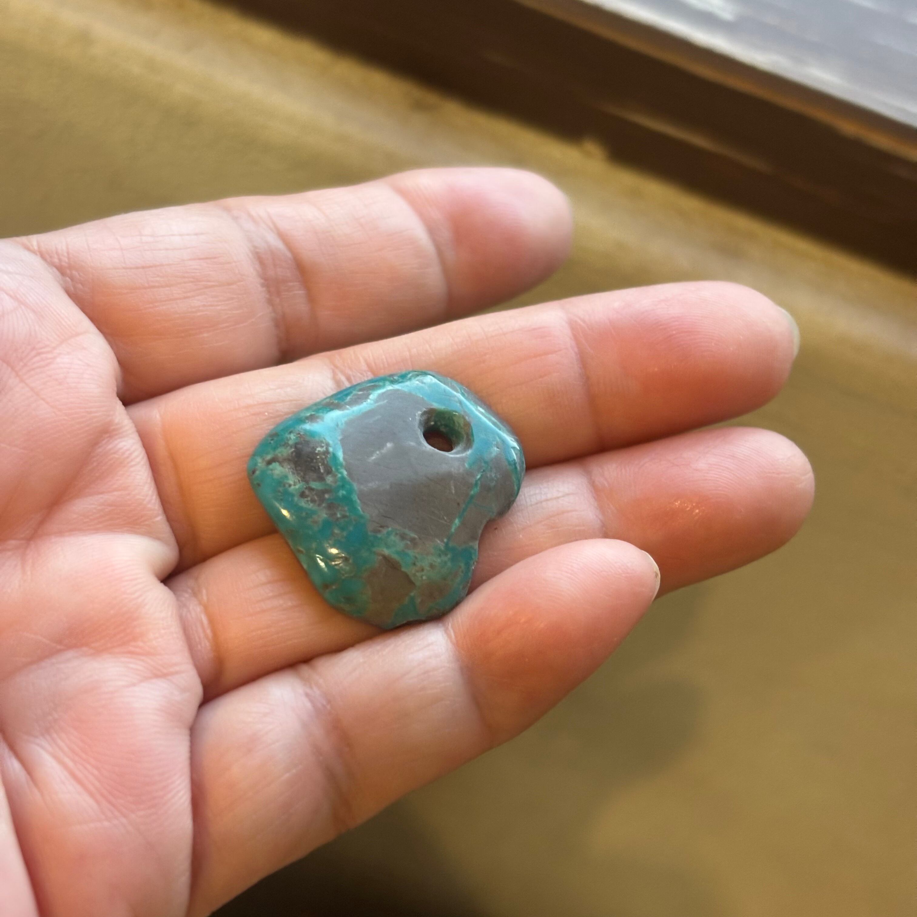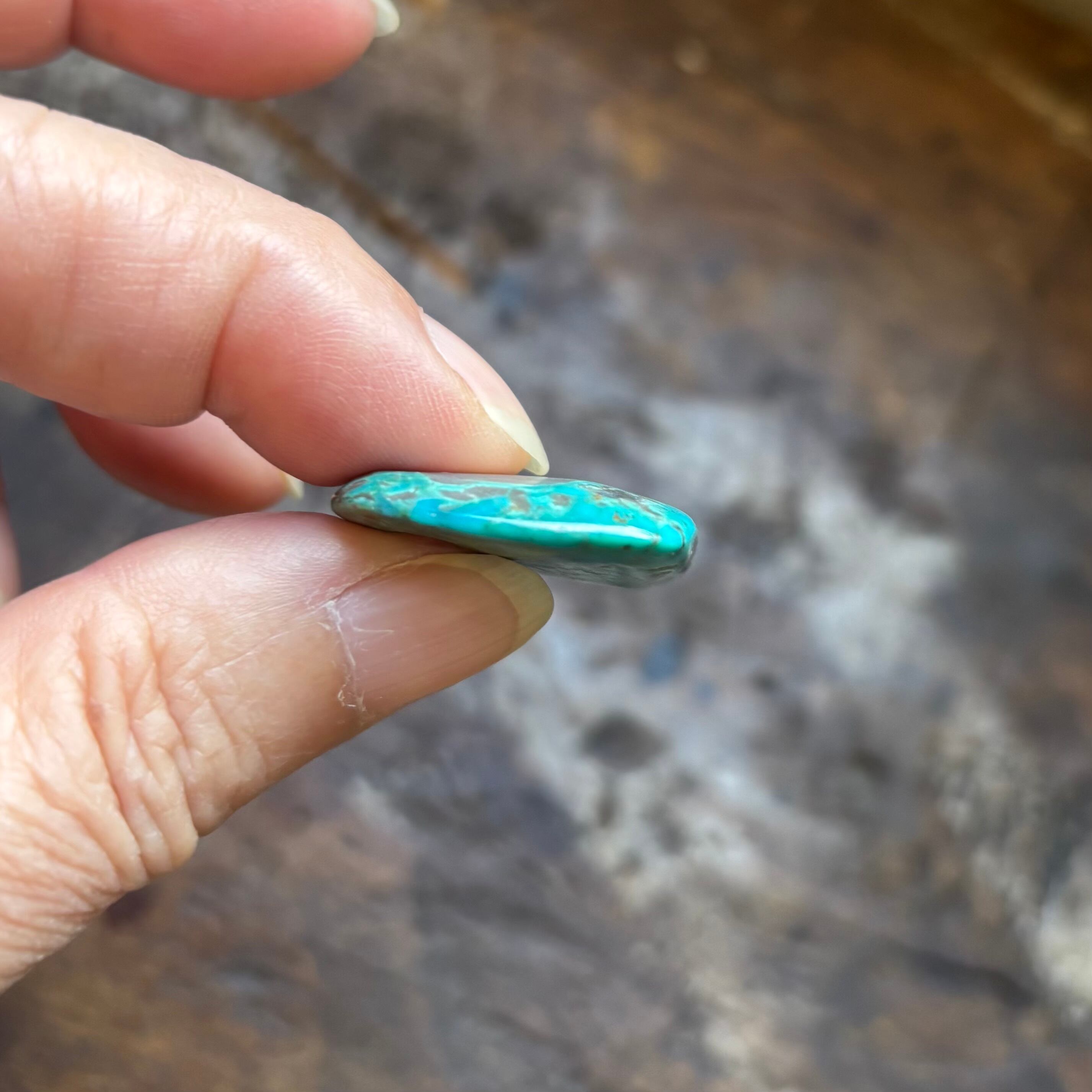 濃いブルーグリーンカラーのフリーフォーム ビーズです。トップにも十分な大きさあり。リバーシブルですが、片面には大き目の母岩が居座っています。母岩側がややぷっくりとラウンドし、もう片面は比較的水平です。母岩(ダークブラウン)はやや柔らかめ。整え切らないラフシェイプです。