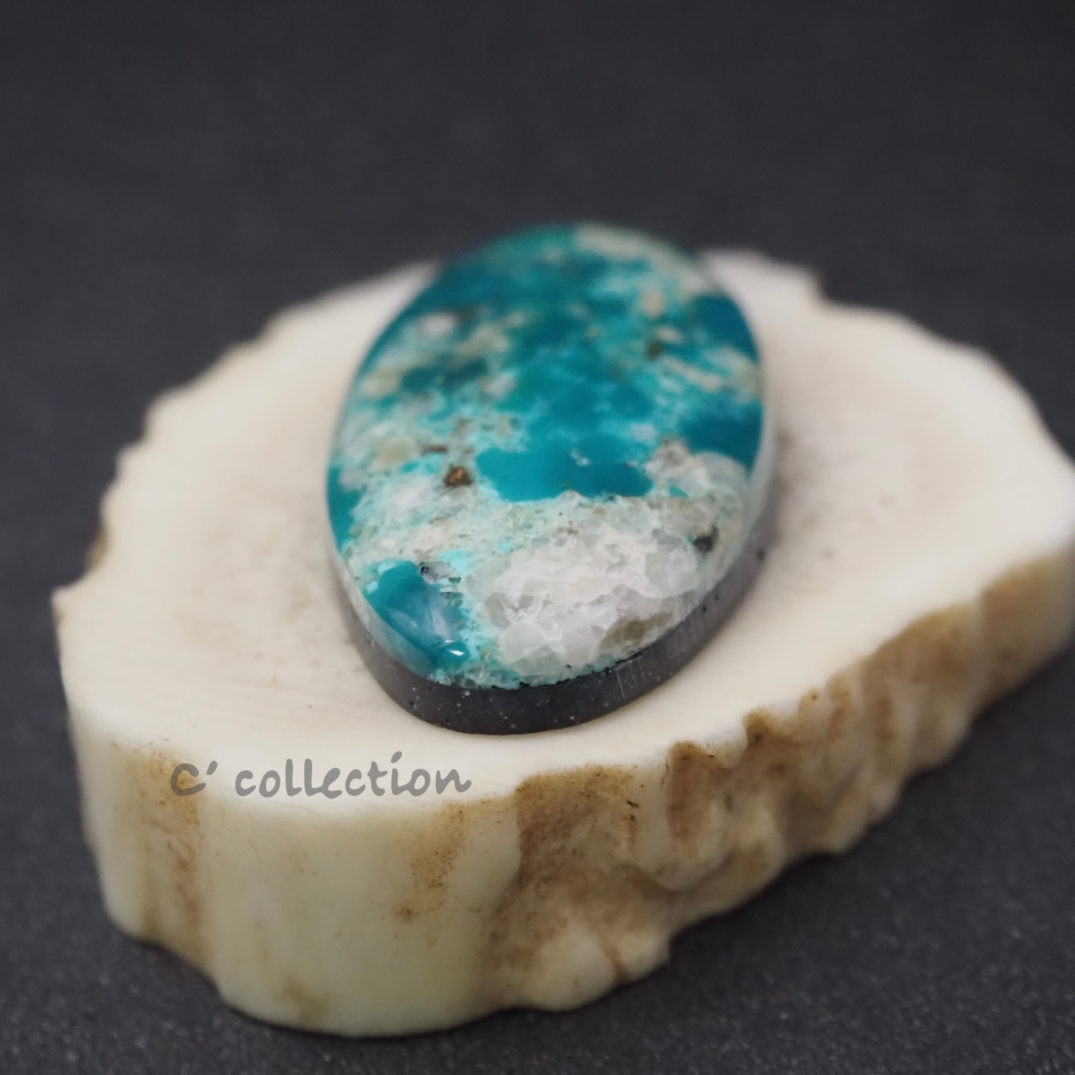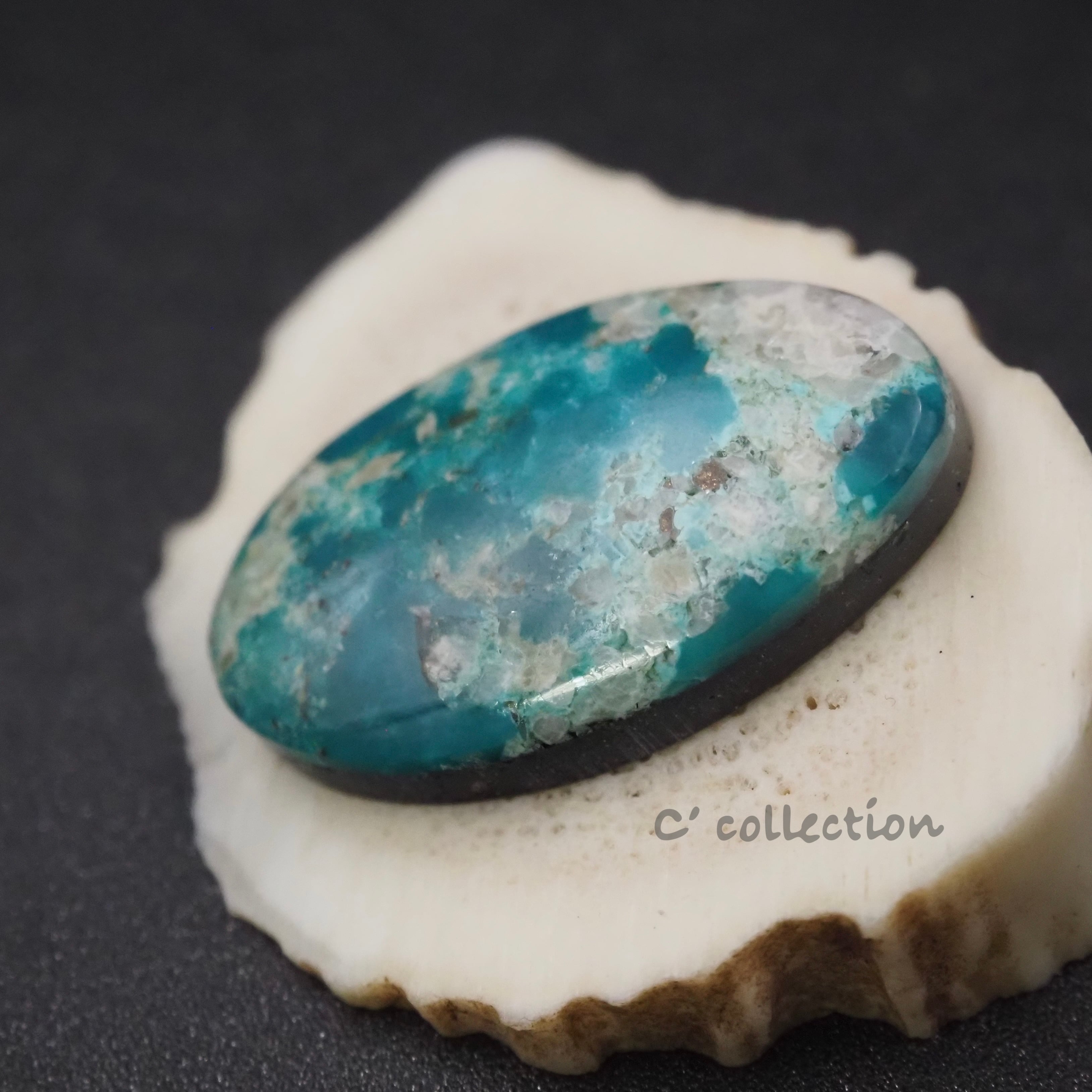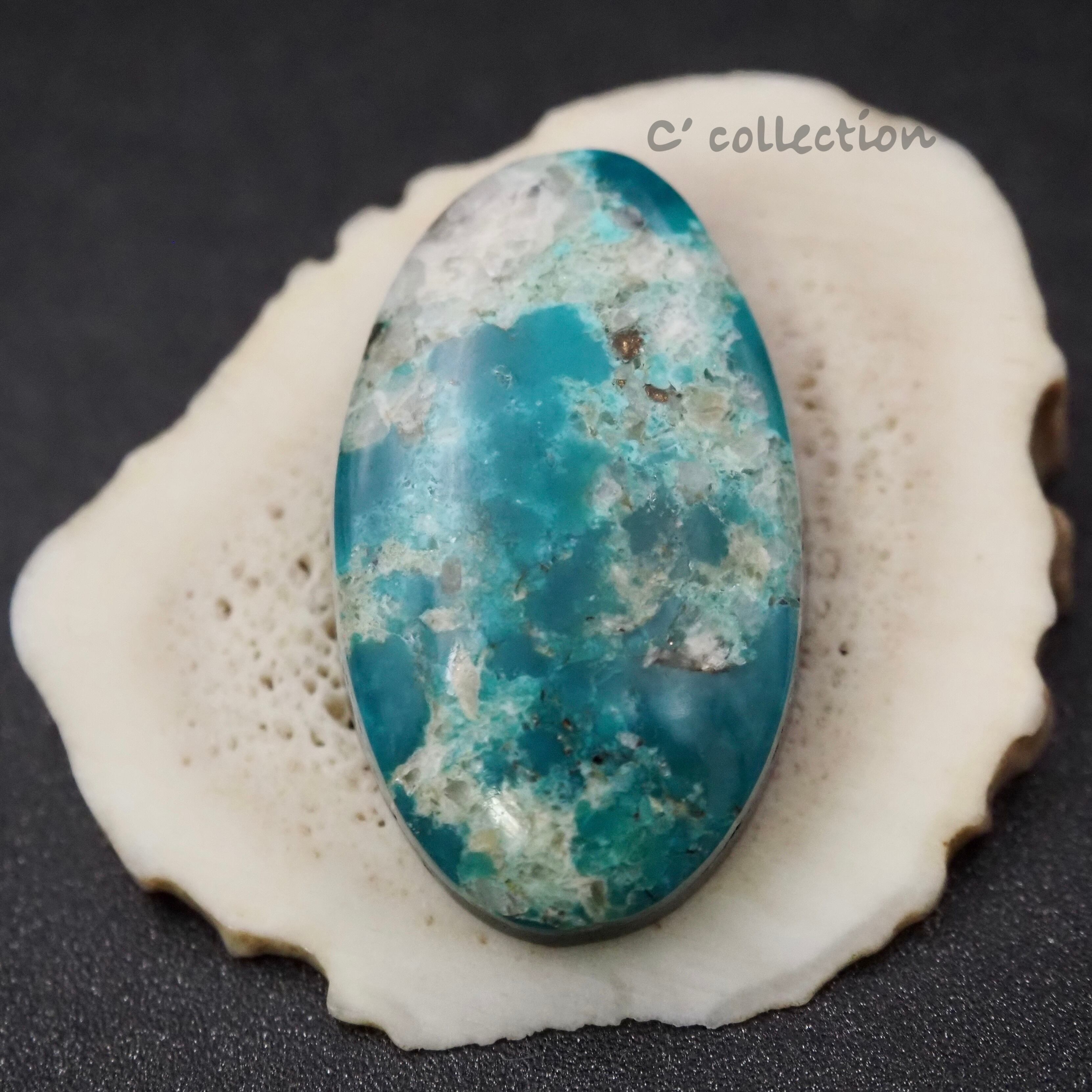 大粒なオーバル型のルース。透明感のあるブルーグリーンと水晶、石英などの白からベージュの鉱物が混じり合う珍しいカラーのターコイズです。コレクションしたい鉱山の一つです。
