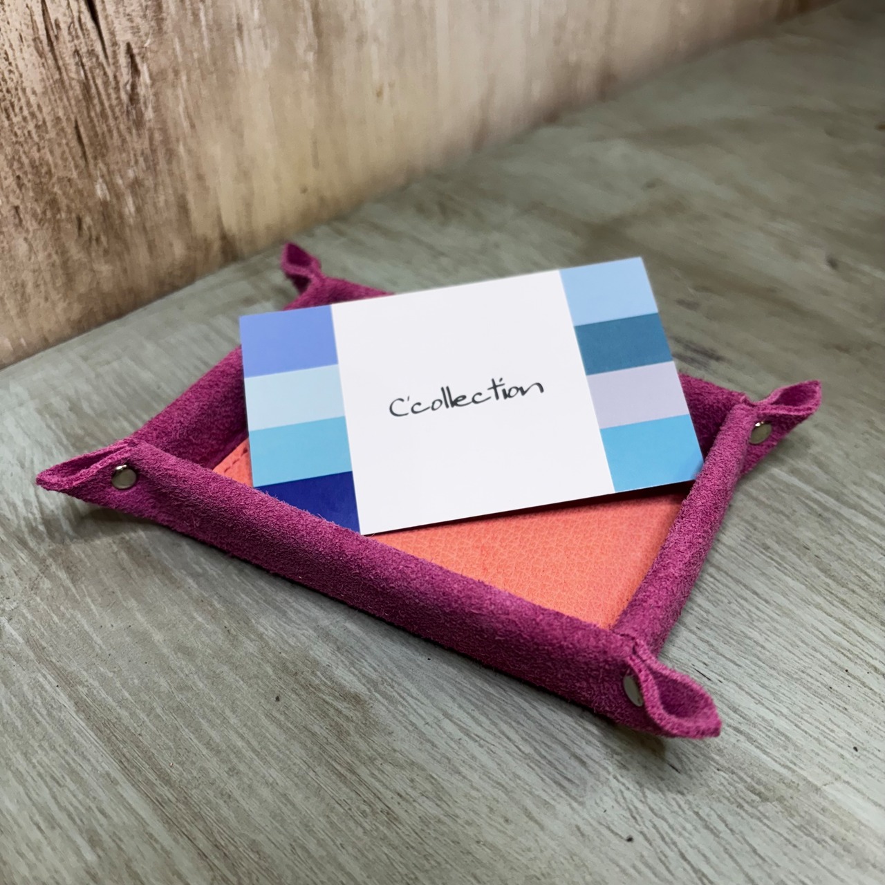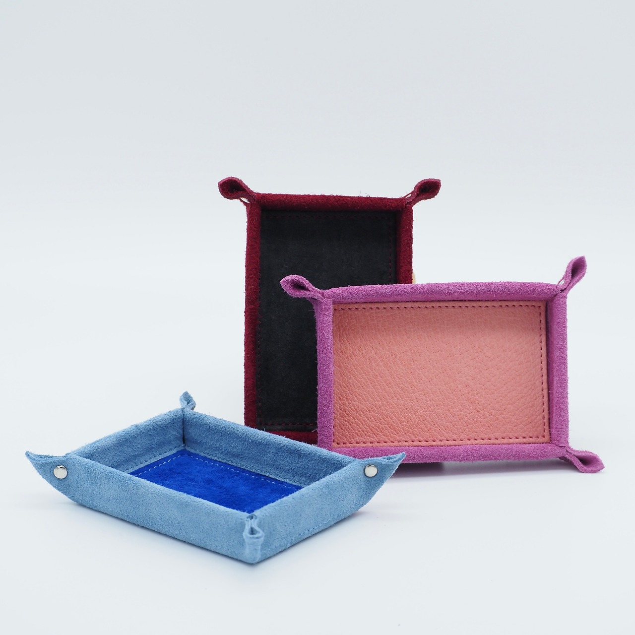 柔らかく厚みのある牛革ベロアに発色の良いピッグスエード を組み合わせた名刺サイズのトレイです。牛革ベロアの抑えたカラーとスエードの綺麗なカラーのコンビがアクセントになっています。柔らかな本革製なのでアクセサリーなどの大切な物を傷付けません。