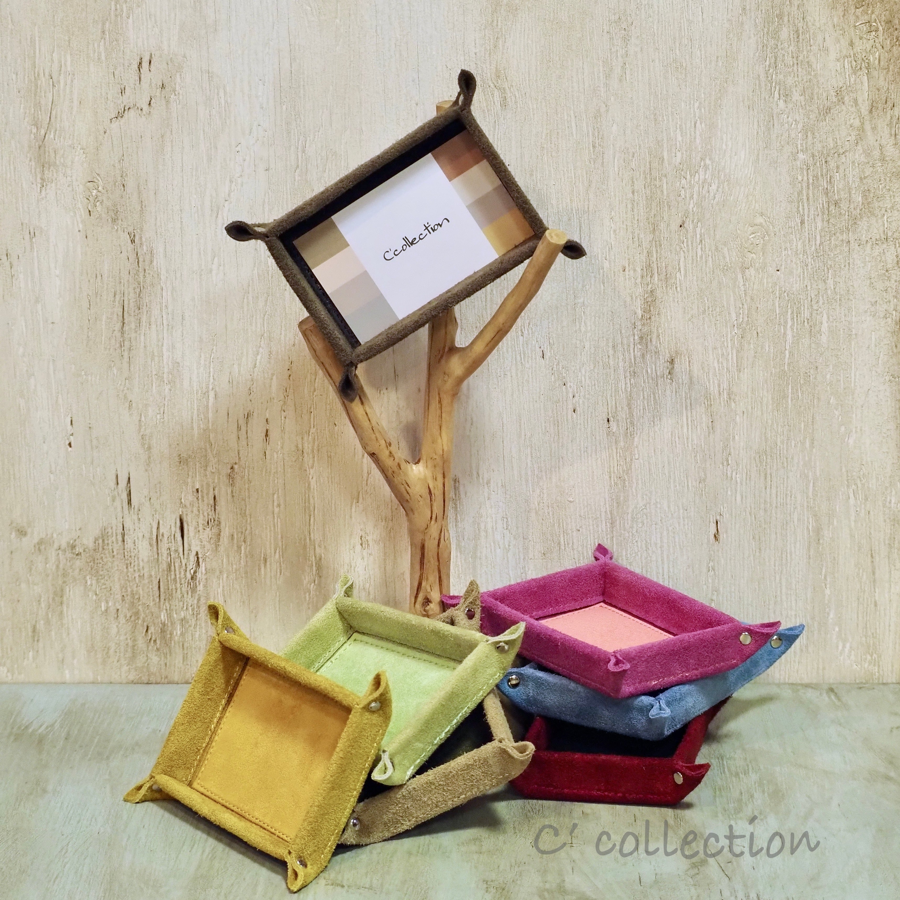 柔らかく厚みのある牛革ベロアに発色の良いピッグスエード を組み合わせた名刺サイズのトレイです。牛革ベロアの抑えたカラーとスエードの綺麗なカラーのコンビがアクセントになっています。柔らかな本革製なのでアクセサリーなどの大切な物を傷付けません。