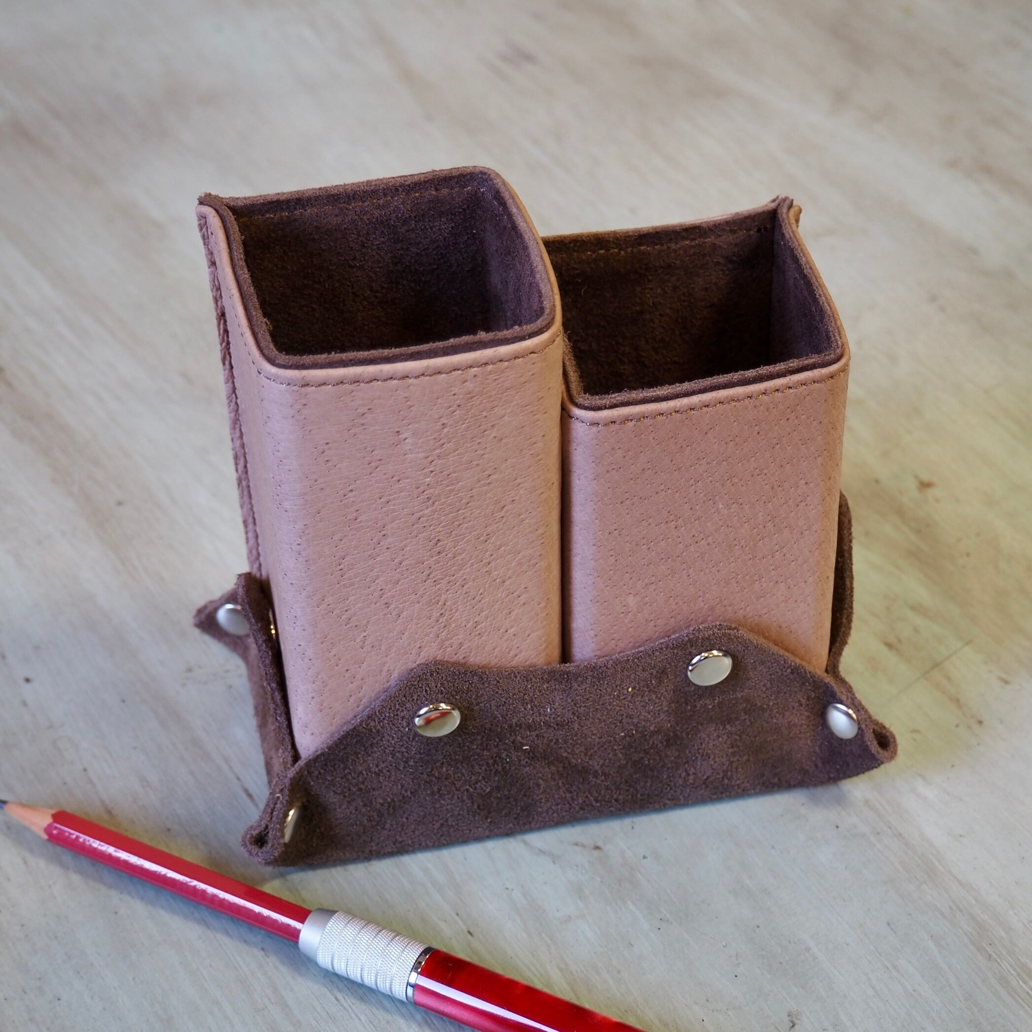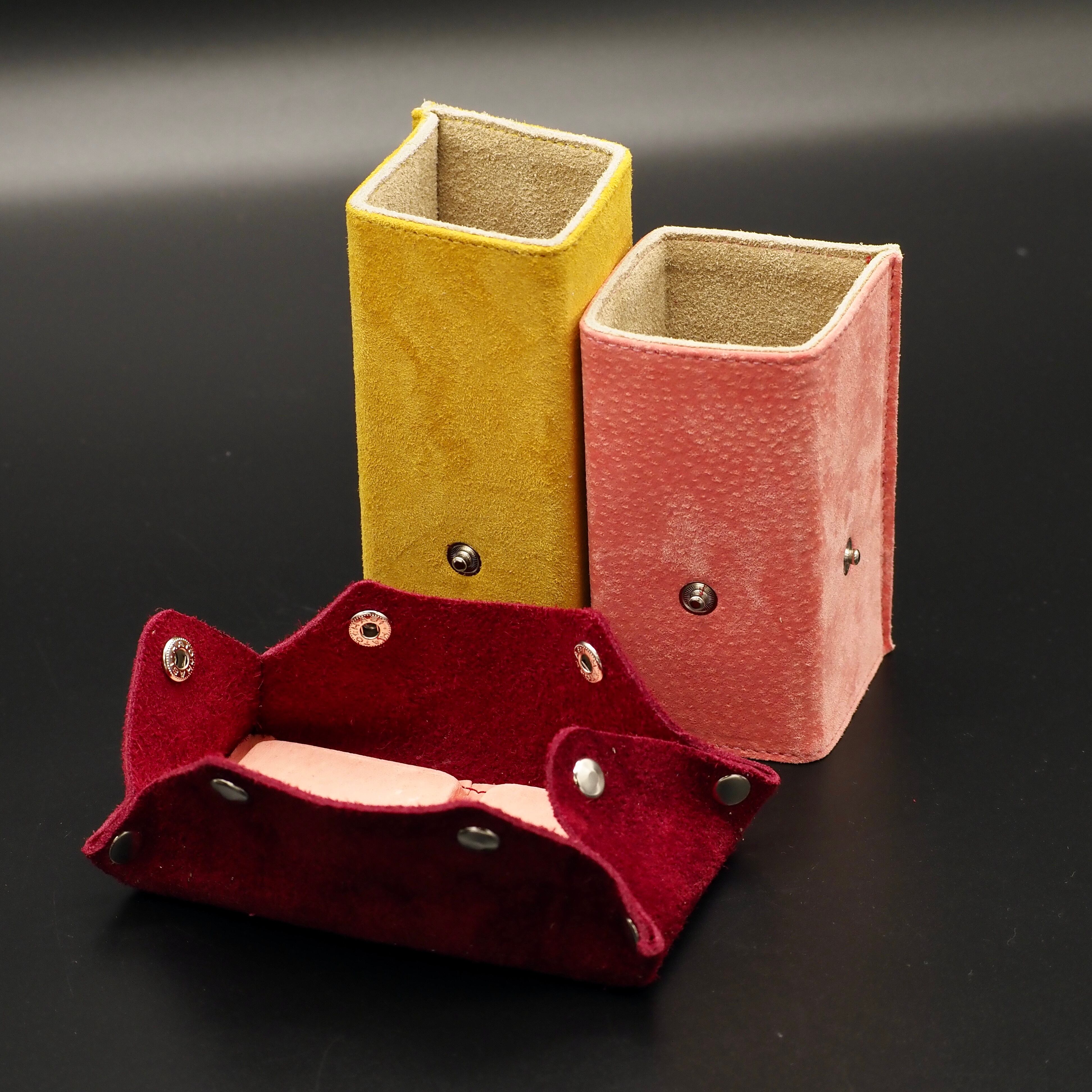 メガネや万年筆、ペンスタンド等多目的に使用できます。丈夫な芯材とステンレス製のウェイトを柔らかなスウェードとベロアの本革で包み込み、大切なメガネやペンなどを傷つけない安心感と強度を持たせています。内側に金具の露出もなく全面柔らかな本革です。