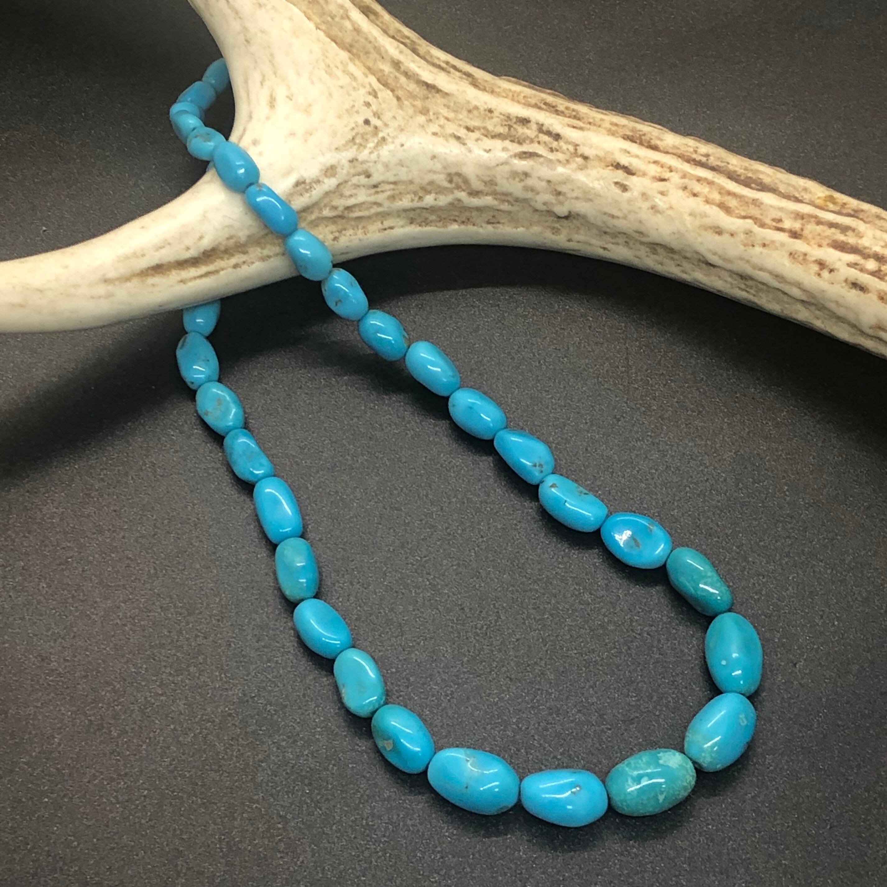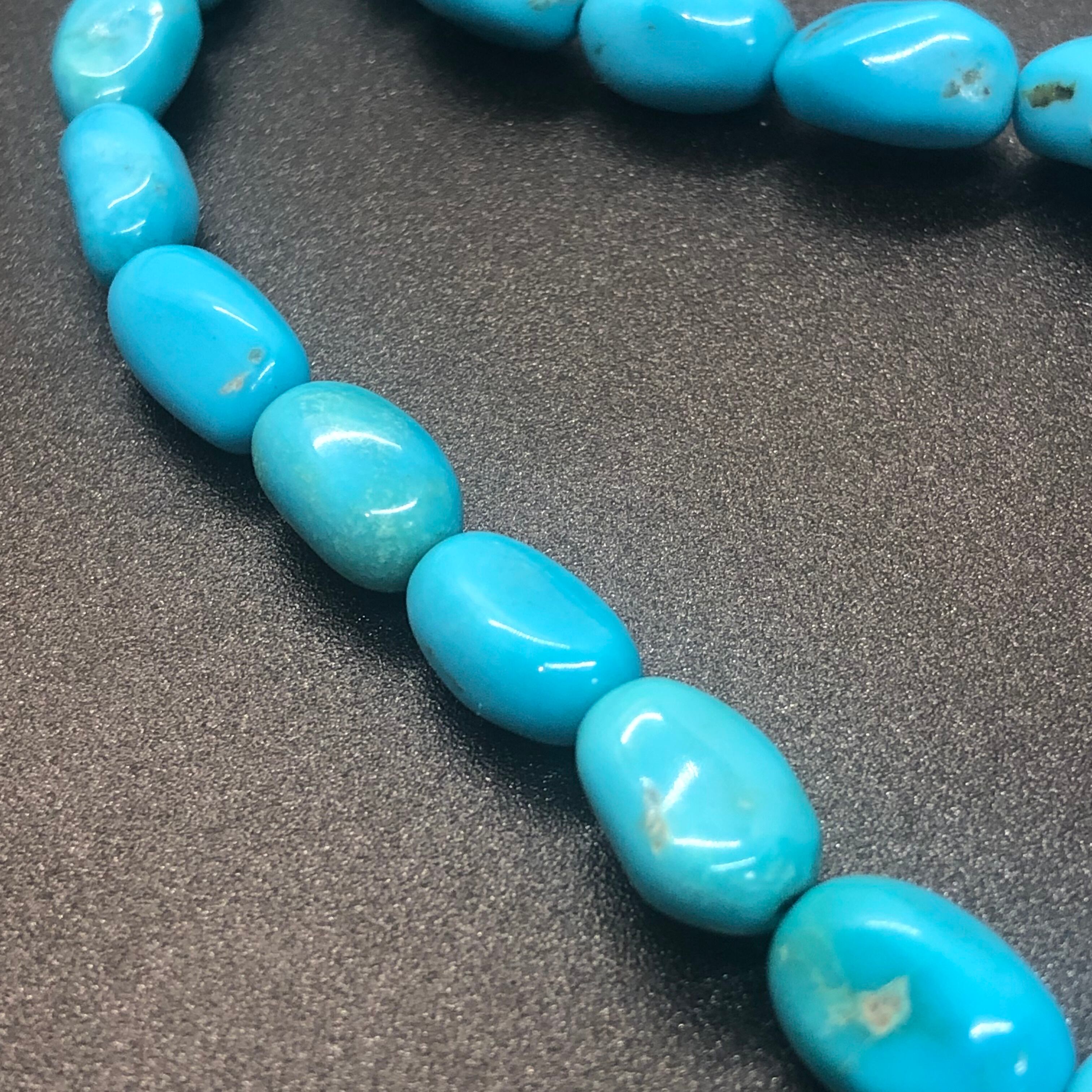 自然の形を生かしたタンブル型。形やカラー全てが均一ではないながら、一粒一粒に惹かれる魅力がありどれもとてもキレイです。少々のマトリックスが混じり、カラーに少々の濃淡があります。一目でスリーピングとわかる美しいターコイズです。