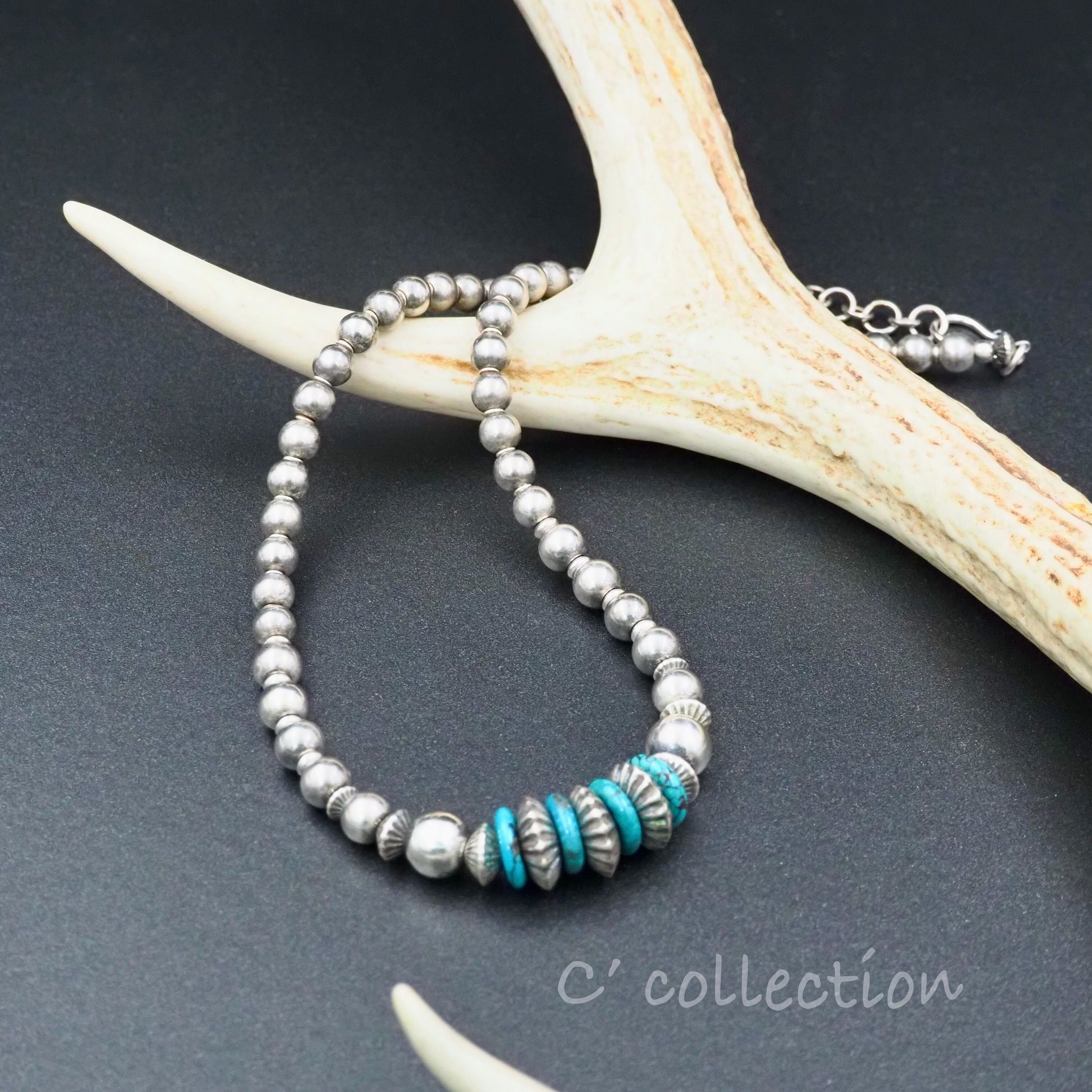 ハンドメイド リポウズ シルバービーズとターコイズビーズをメインにしたナバホパールネックレス。燻し加工後、黒い部分が残らないようパールのようなヘアライン仕上げでグレイシルバーに磨き上げました。凹部分は多少黒いです。ラウンドビーズの間にそろばん型のビーズを挟んで安定感のあるネックレスに仕上げています。